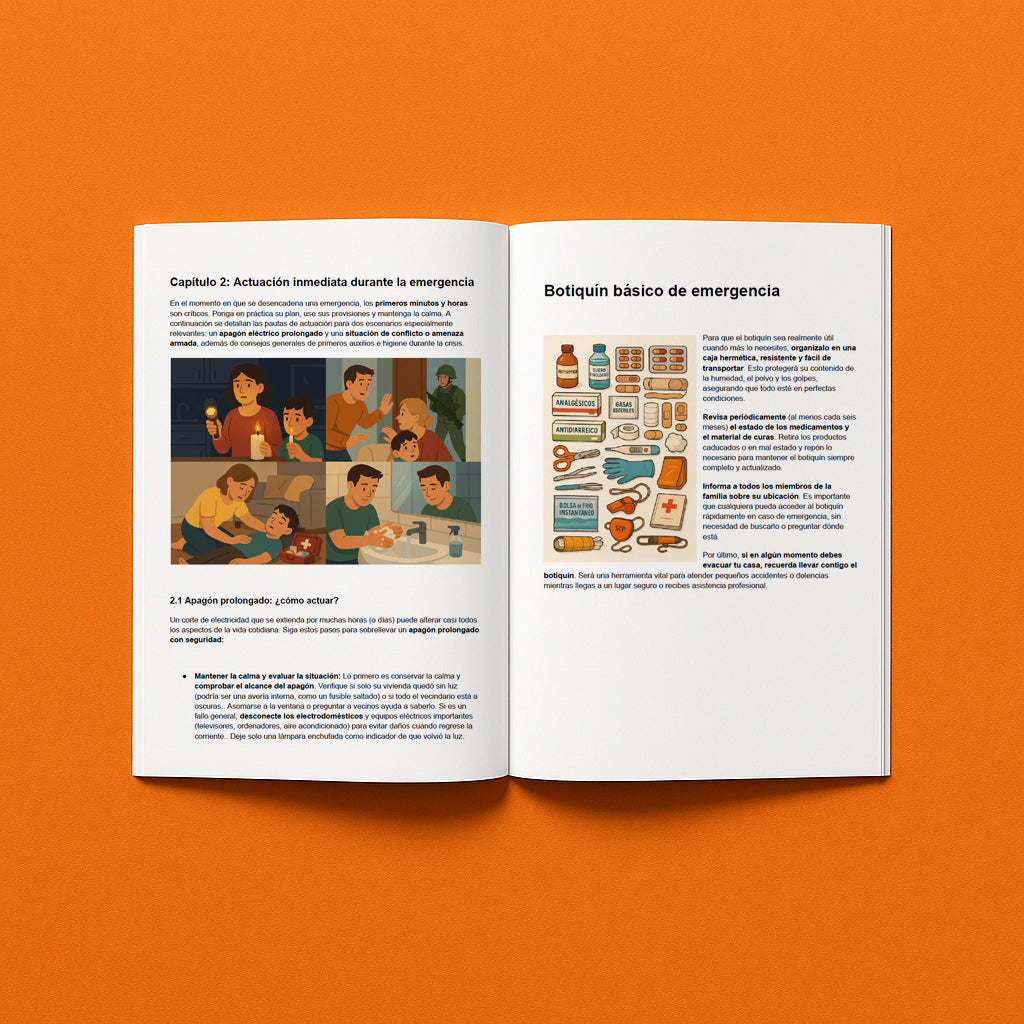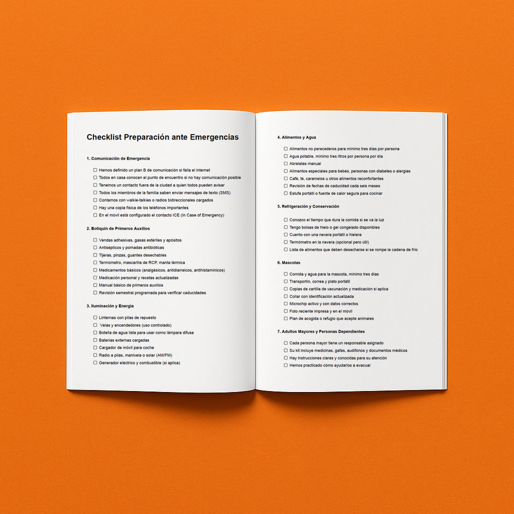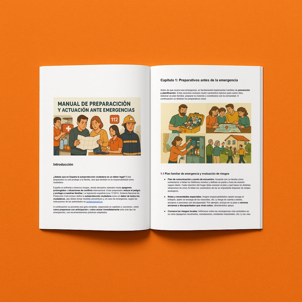 Una guía práctica y completa que te enseña cómo prepararte y actuar ante situaciones críticas como apagones prolongados, cortes de suministros, evacuaciones o amenazas derivadas de conflictos. Contiene instrucciones claras sobre qué alimentos y recursos almacenar, cómo comunicarte si fallan las redes, cómo cuidar de personas vulnerables y mascotas, cómo proteger tu hogar y mantener la higiene sin agua corriente. Está basado en recomendaciones oficiales y pensado para familias en España que quieren estar prevenidas, tranquilas y listas para cualquier emergencia.